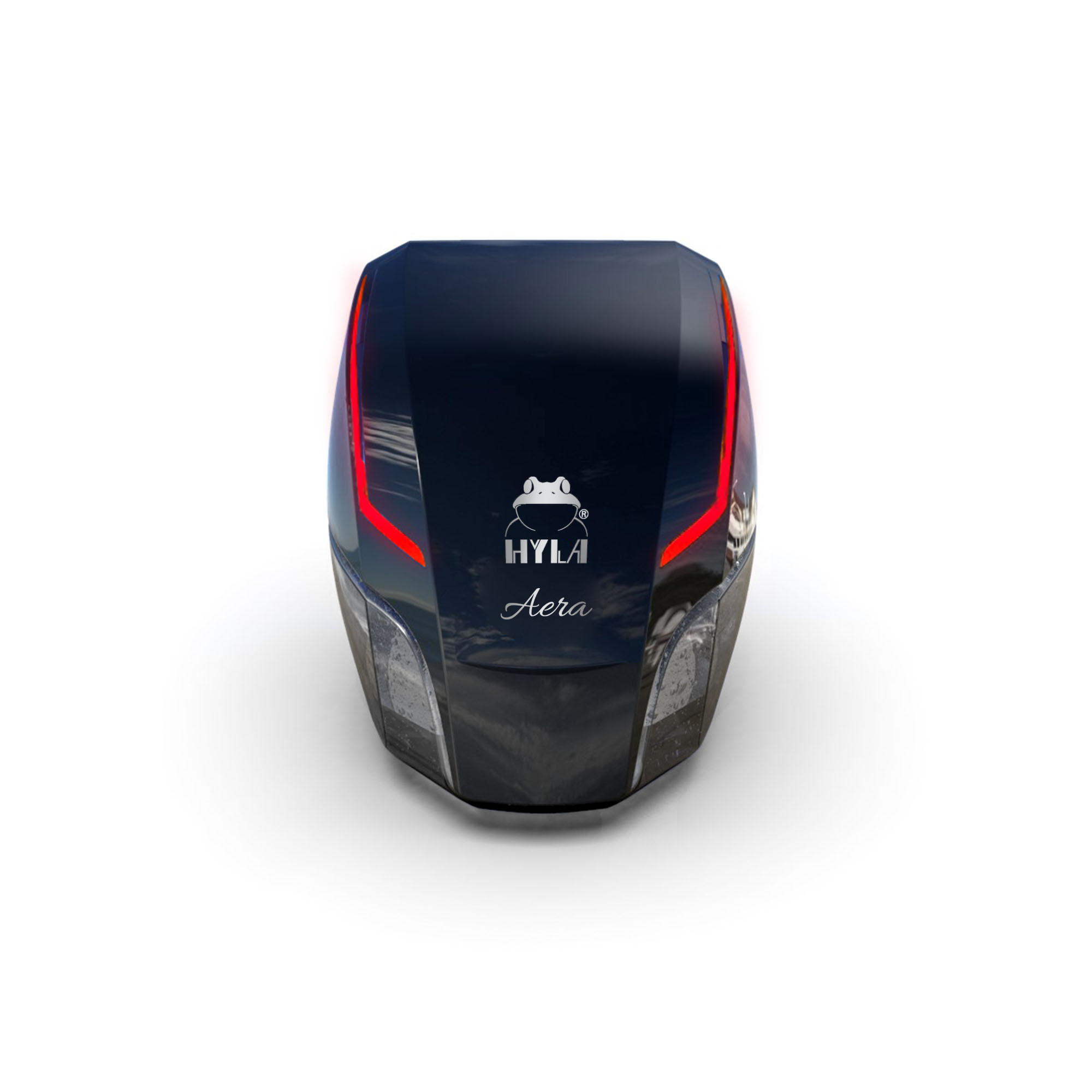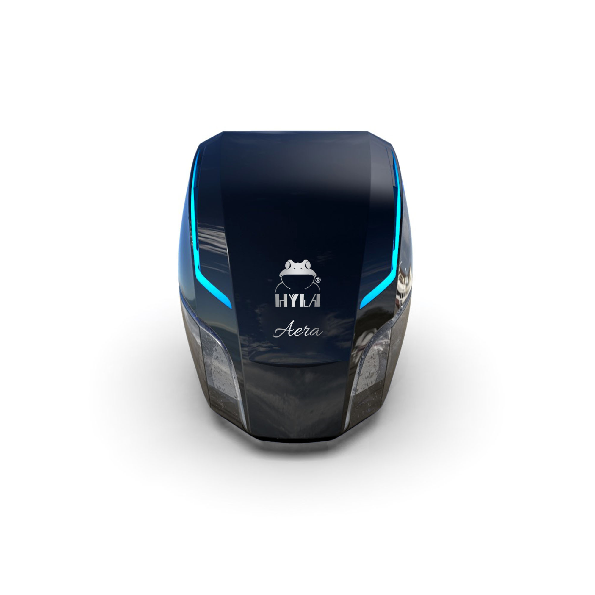 Der AERA Lufterfrischer besteht aus nur zwei Teilen: der Motor-Einheit mit LED-Lichtern und dem Wasserbehälter. Das glänzende schwarze Cover und das zentral platzierte HYLA-Logo machen deutlich, dass es sich um ein neues Produkt von HYLA handelt. Die Neuerung des AERA Lufterfrischers ist die HYLA AERA App, mit der das Gerät über das Smartphone gesteuert werden kann. Die App ermöglicht es dem Nutzer das Gerät zu Aktivieren und aus Millionen von Farben zu wählen oder seinen eigenen Lichteffekt zu kreieren.